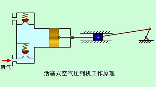 活塞式空氣壓縮機(jī)的工作原理:活塞式空壓機(jī)在氣缸內(nèi)作往復(fù)運(yùn)動的活塞向右移動時,氣缸內(nèi)活塞左腔的壓力低于大氣壓力,吸氣閥開啟,外界空氣吸入缸內(nèi),這個過程稱為壓縮過程。當(dāng)缸內(nèi)壓力高于輸出空氣管道內(nèi)壓力后,排氣閥打開?;钊耐鶑?fù)運(yùn)動是由電動機(jī)帶動的曲柄滑塊機(jī)構(gòu)形成的。曲柄的旋運(yùn)動轉(zhuǎn)換為滑動--活塞的往復(fù)運(yùn)動。這種結(jié)構(gòu)的壓縮機(jī)在排氣過程結(jié)束時總有剩余容積存在。在下一次吸氣時,剩余容積內(nèi)的壓縮空氣會膨脹,從而減少了吸入的空氣量,降低了效率,增加了壓縮功。